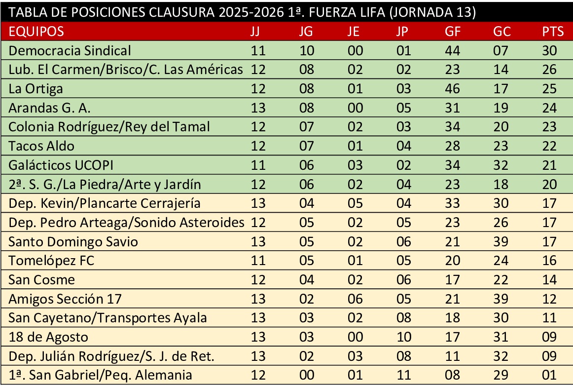 Se jugó la cabalística jornada 13 en torneo clausura correspondiente a la máxima categoría de la Liga Irapuatense de Futbol Amateur (LIFA) y de sus resultados puede decirse no hubo sorpresas. Los equipos señalados como favoritos salieron con banderas desplegadas y con ello, cada vez se acercan más al objetivo primario que es calificar para la postemporada.