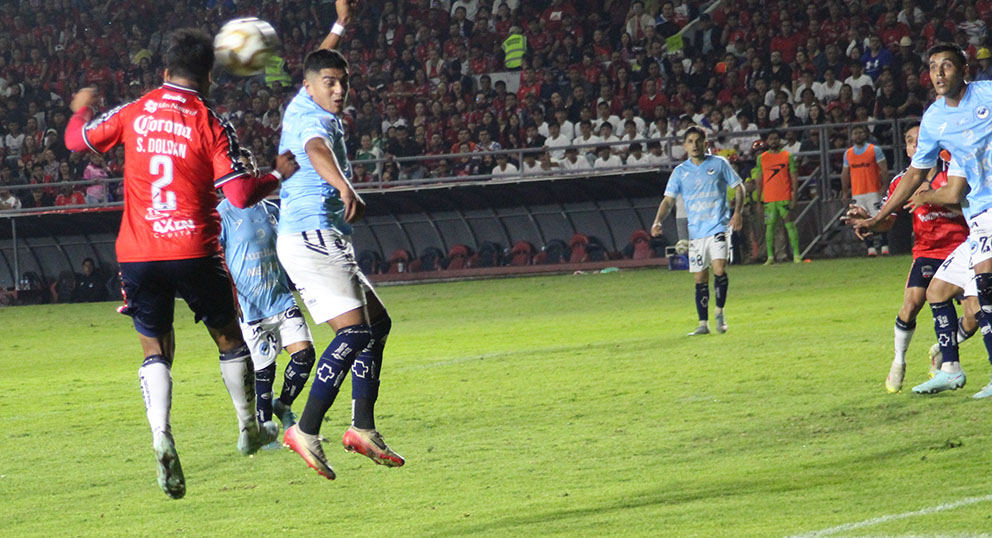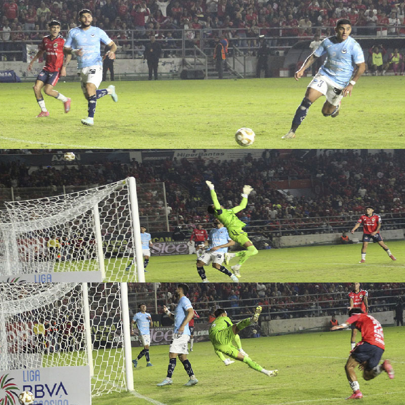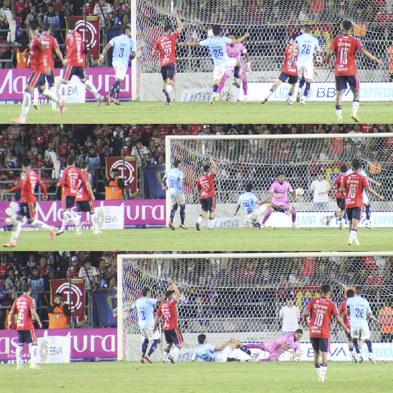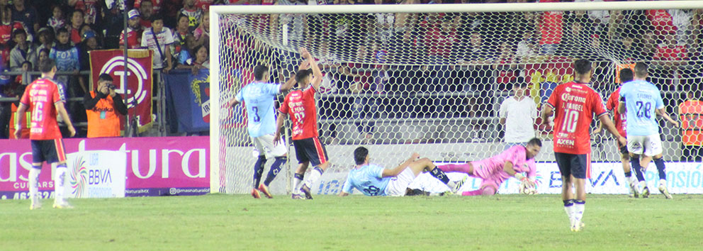 Corría el segundo de los seis minutos que decidió el colegiado agregar cuando vino la enésima jugada por derecha. A la distancia pareció ser Zamudio quien se integró al ataque mandó el servicio al espacio para ver quién llegaba, viéndose la cara de angustia de los defensores que esperaban lo peor. Fue Memo Muñoz quien remató como venía y cuando se cantaba el gol, se fue por encima del larguero. Dio la impresión que el guardameta la alcanzó a desviar, pero no concedieron el tiro de esquina.