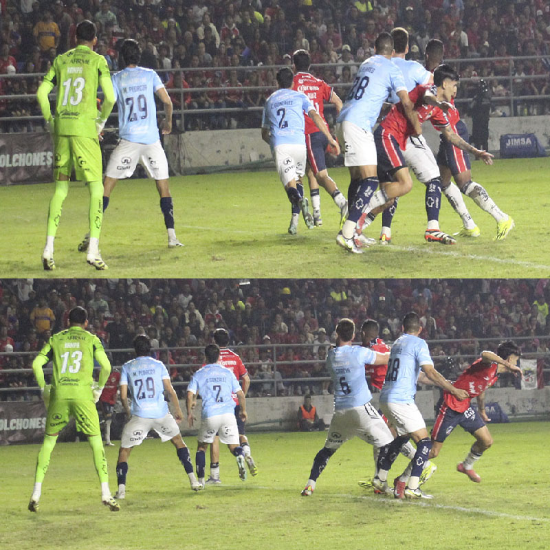 Empezaba a ser agobiante el dominio fresero. El balón circulaba más tiempo cerca de la portería rival. Vino una acción precedida de balón detenido. Sergio Flores, perdió un poco de vista al jugador fresero que estaba marcando y no le quedó más que abrazarlo y luego jalarlo. Afortunadamente para su causa, el silbante no señaló la infracción, posiblemente porque no la miró, pero fue muy clara la falta.