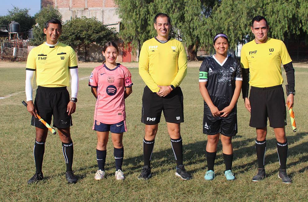 Tripleta arbitral y capitanas de las escuadras finalistas.